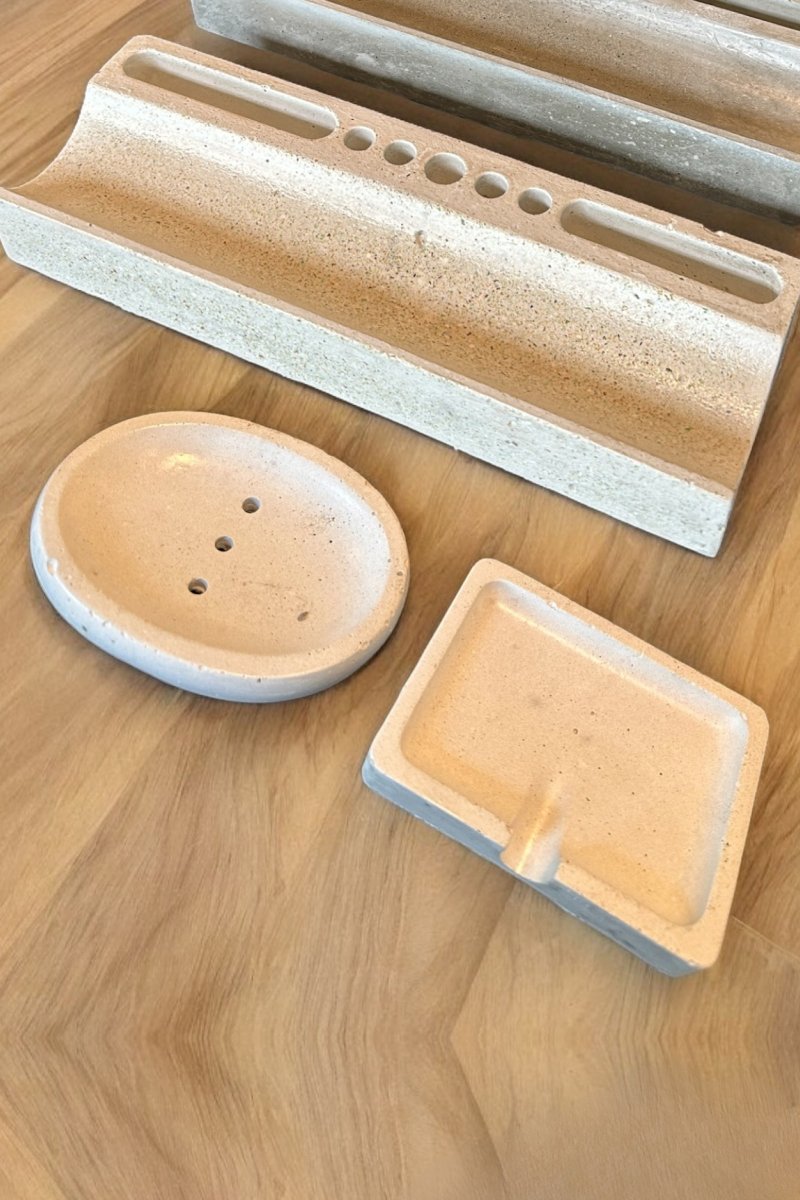 This soap dish is thoughtfully crafted from glass sand cement, made by transforming discarded glass bottles into something functional and lasting. Each piece is handmade by a community of women who turn waste into purposeful design, combining strength, sustainability, and creativity.